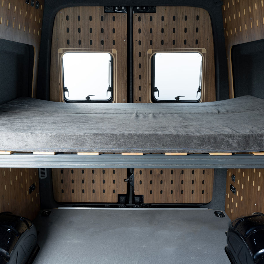 Bett mit einer Liegefläche von 1900x1400mm, zusammengezogen 1900mmx1000mm. Das Bett kann mühelos zusammengeschoben werden, um tagsüber mehr Platz zu haben und es ermöglicht so einen besseren Zugang zu Transportgut oder an Regale unter dem Bett. Die Bettverlängerung verläuft an Profilschienen, die an der Wand befestigt sind. Wenn das Bett zusammengezogen ist, bildet sich ein barrierefreier Raum. Das Bett kann auch heckseitig zusammengeschoben werden um dort hohe, sperrige Teile zu verladen. Durch die Anordnungen des Bett-Moduls bildet sich ein Laderaum/Garage unter dem Bett für Ladegut, Gepäck, Sportartikel.